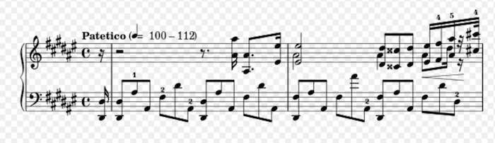 Also, the figuration of tuplets, which are appearing simultaneously (such as 2 against 3 or 3 against 4), is very typical for Scriabin, and only become more elaborate, physically as well as musically, in the later works of Scriabin.